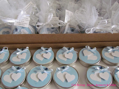 Seguindo as cores da decoração: azul e branco, desenvolvi duas versões usando apliques de coração em papel cintilante: